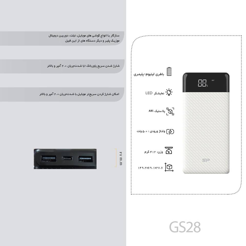 شارژر همراه سیلیکون پاور مدل GS28 ظرفیت 20000 میلی آمپر ساعت، پاوربانکی است که می‌توانید به‌راحتی و سهولت از آن استفاده‌های مفیدی داشته باشید. پاوربانک را می‌‌توان به‌عنوان باتری یدک برای دستگاه‌های دیجیتالی به‌خصوص موبایل، تبلت و اکسسوری‌ها دانست. شارژر همراه سیلیکون‌پاور مدل GS28 ظرفیت 20000 میلی آمپر ساعت محصولی از برند سیلیکون‌پاور است که در ابعاد کوچک و جمع‌وجور طراحی و تولید شده است. اولین و مهم‌ترین مشخصه برای انتخاب پاوربانک ظرفیت آن است. این مدل ظرفیت 20000 میلی‌آمپرساعت دارد. وزن این مدل 412 گرم و در دسته شارژر همراه‌های معمولی قرار می‌گیرد. این مدل 2 ورودی برای شارژ پاوربانک در اختیارتان قرار می‌دهد. دو کانکتور microUSB و USB-C برای شارژ شدن و دو نوع Type-A که می‌تواند دو دستگاه را به طور همزمان شارژ کنند. با شدت‌جریان ورودی 2.0 آمپری، می‌توان پاوربانک را با سرعت بیشتری شارژ کرد. از این پاوربانک می‌توانید برای شارژ کردن تبلت خود هم استفاده کنید. ولتاژ ورودی و خروجی برای این مدل 5.0 ولت است. برای نمایش میزان باتری پاوربانک می‌توانید از نمایشگرهای LED که برای این مدل تعبیه شده استفاده کنید.